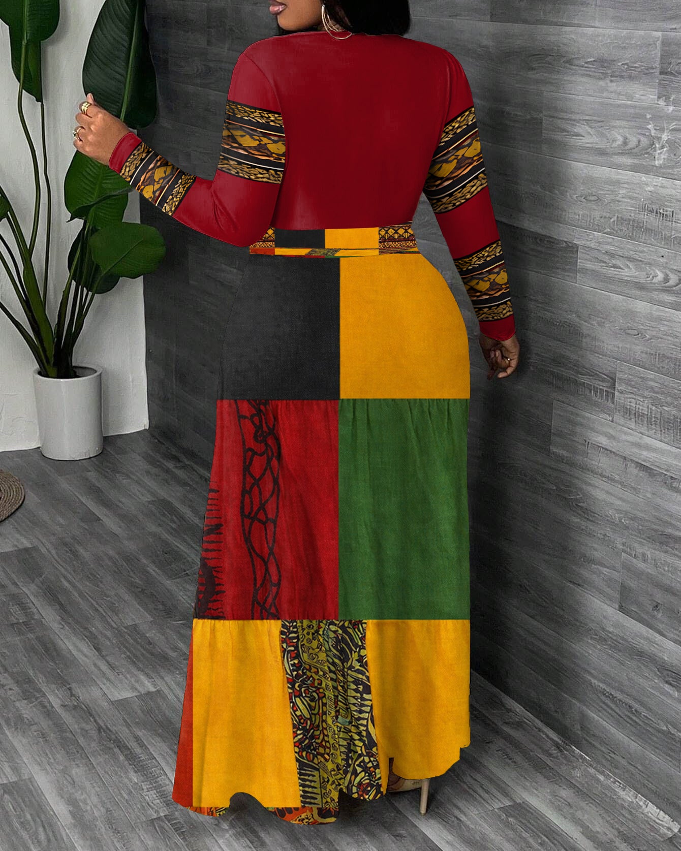 Reggae Color Blocking Print Crewneck Long Sleeve Pocket Dress