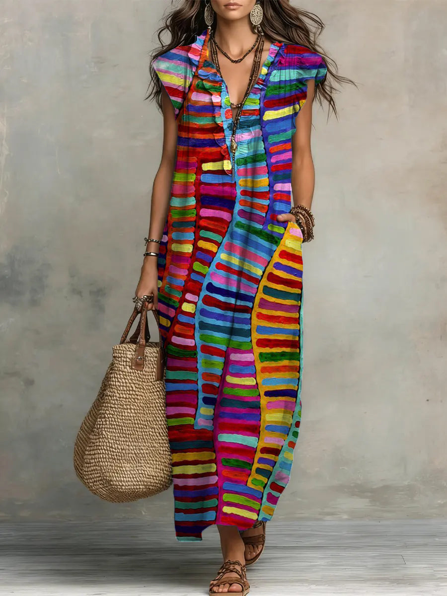 Retro Abstract Colorful Striped Cotton-linen Ruffled Dress