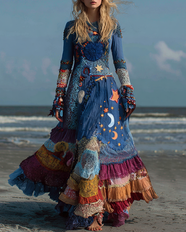 Seaside Irregular Star And Moon Embroidered Lace Patchwork Ruffled Dress be14