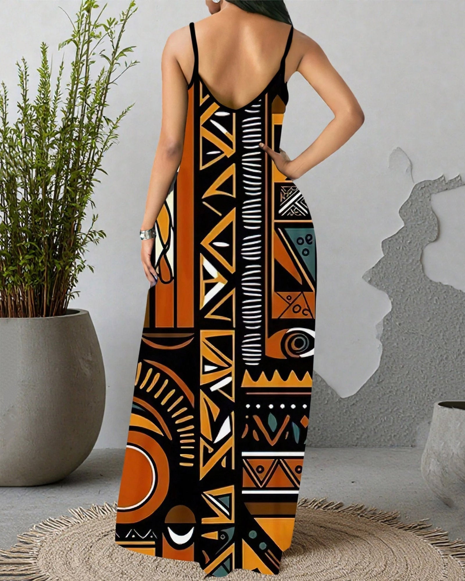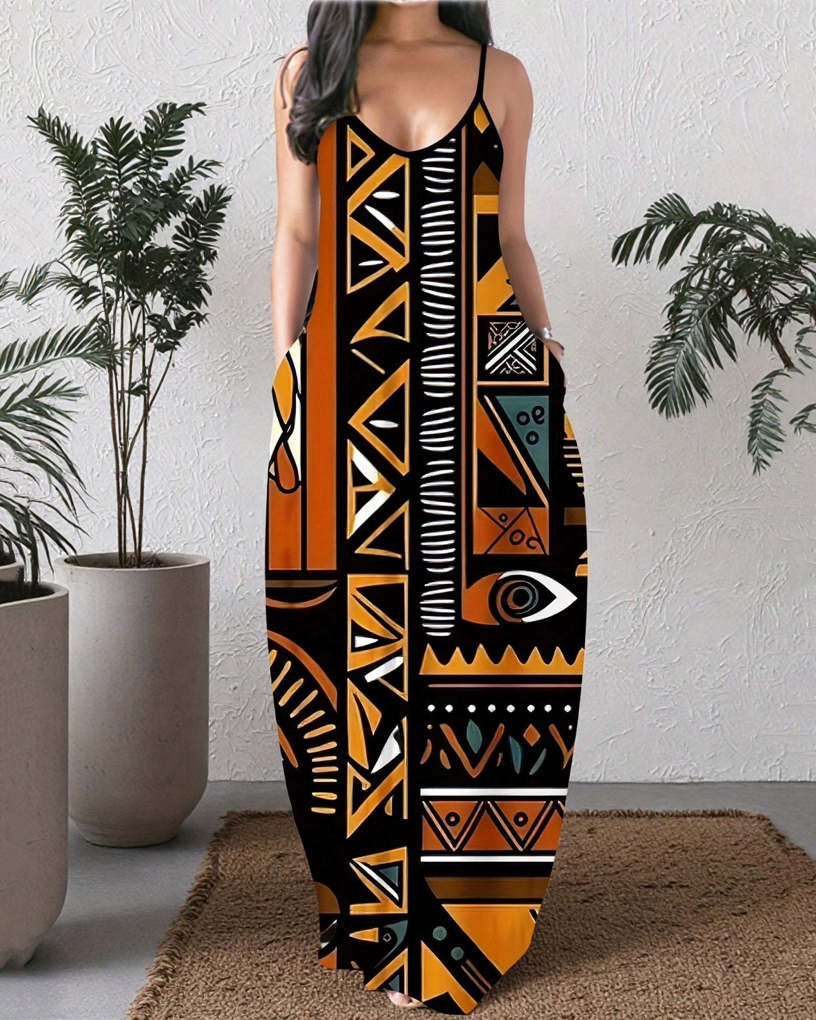 Sling African Mudcloth Digital Print Pocket Maxi Dress