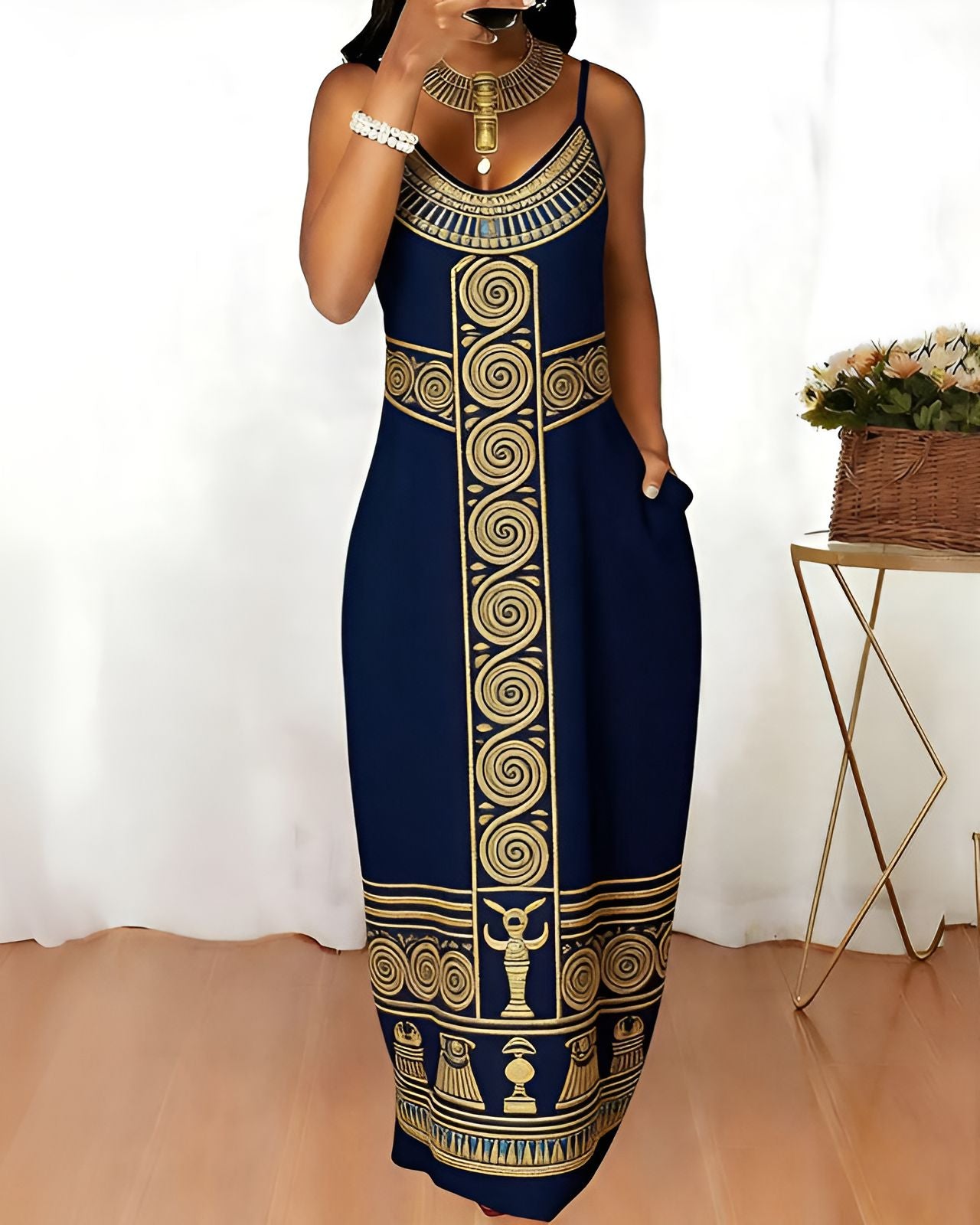 Sling Ancient Egyptian Gold Spiral Geometric Embroidery Pattern Print Pocket Maxi Dress