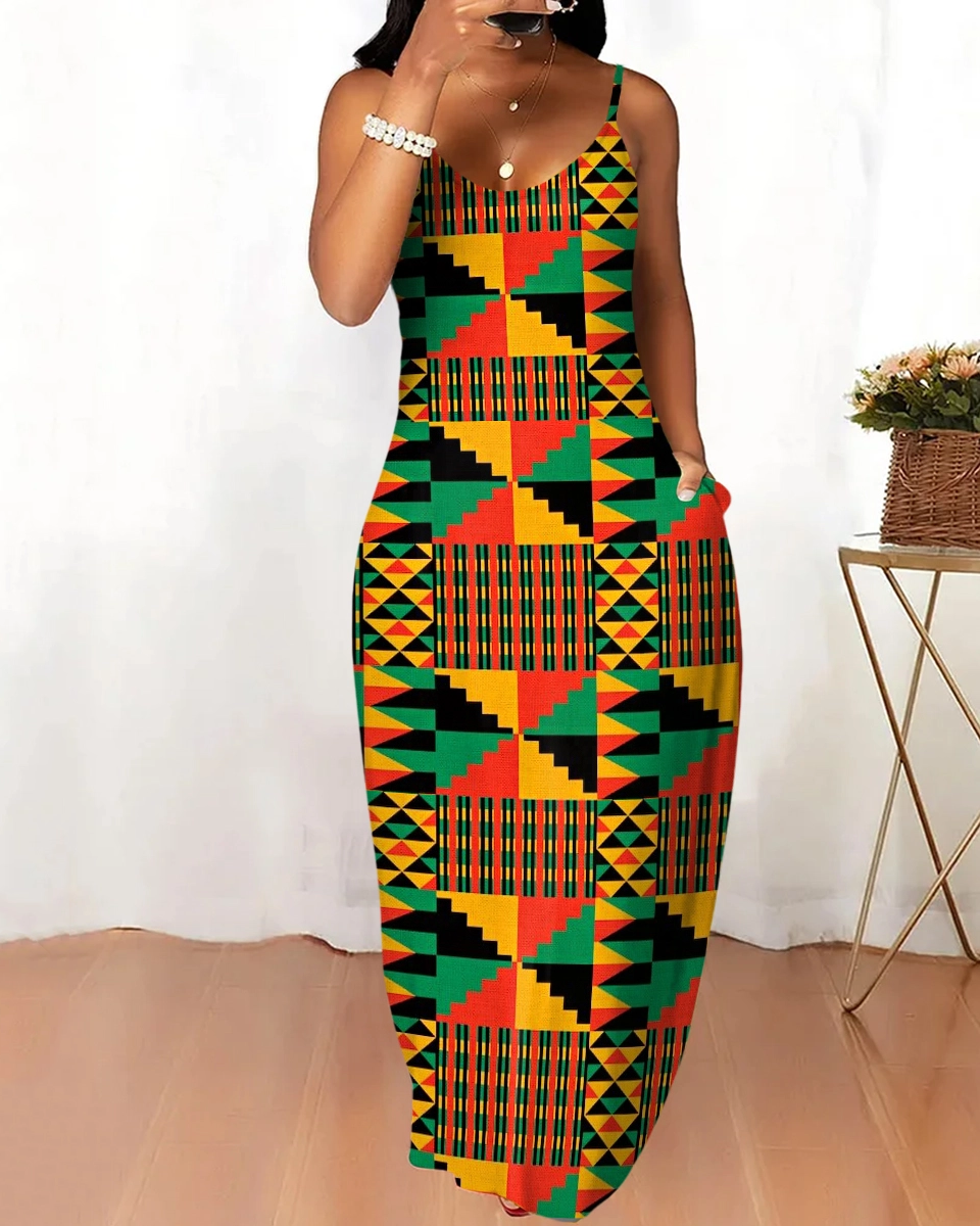 Sling Juneteenth African Geometric Print Pocket Maxi Dress
