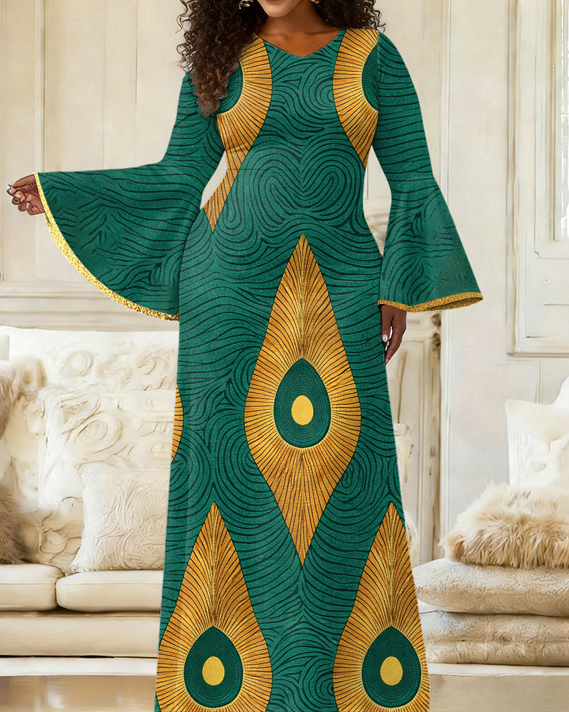 Traditional African Texture Bell-Sleeve Vertical Stripe Slim Fit Dress