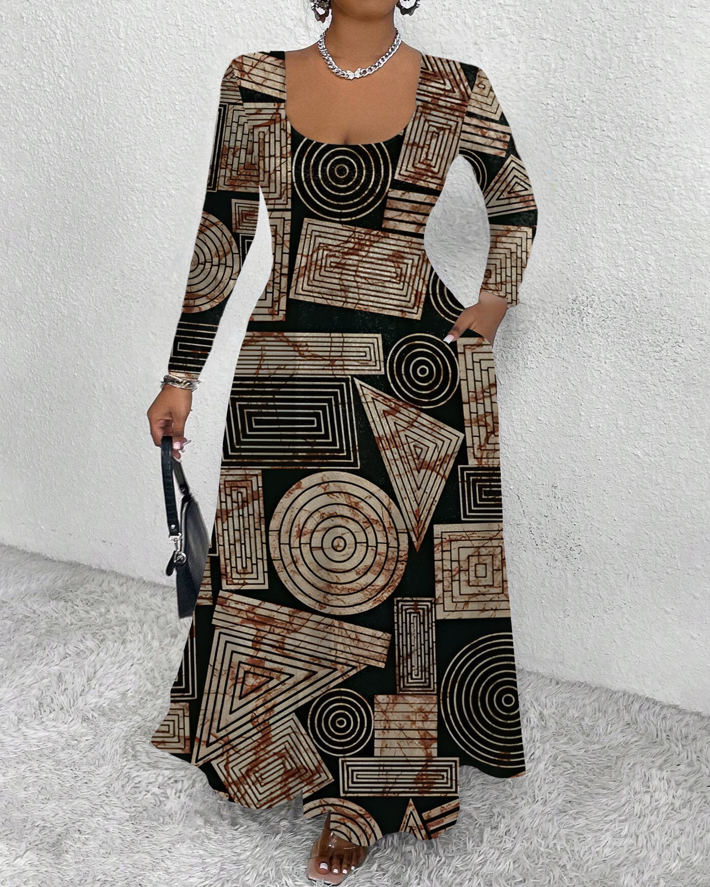 U-neck African Tribal Geometric Print Pocket Long Sleeves Maxi Dress
