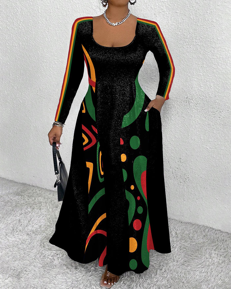 U-neck Black Totem Color Blocking Pocket Long Sleeves Maxi Dress