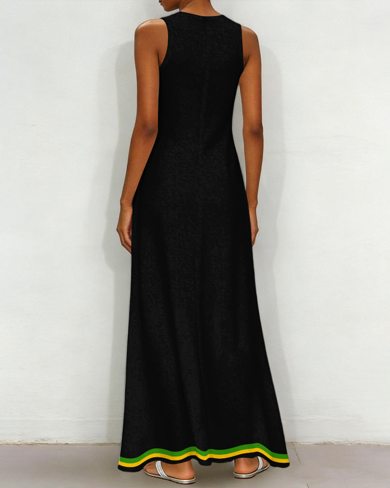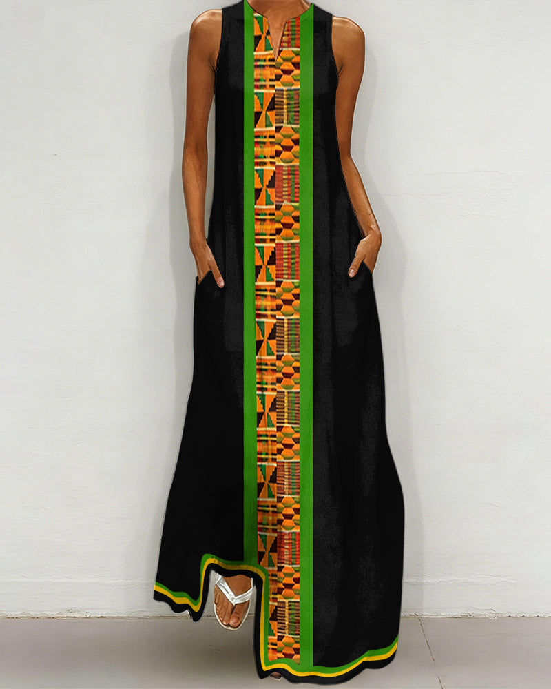 V-Neck African Geometric Stripe Patchwork Pocket Long Dress