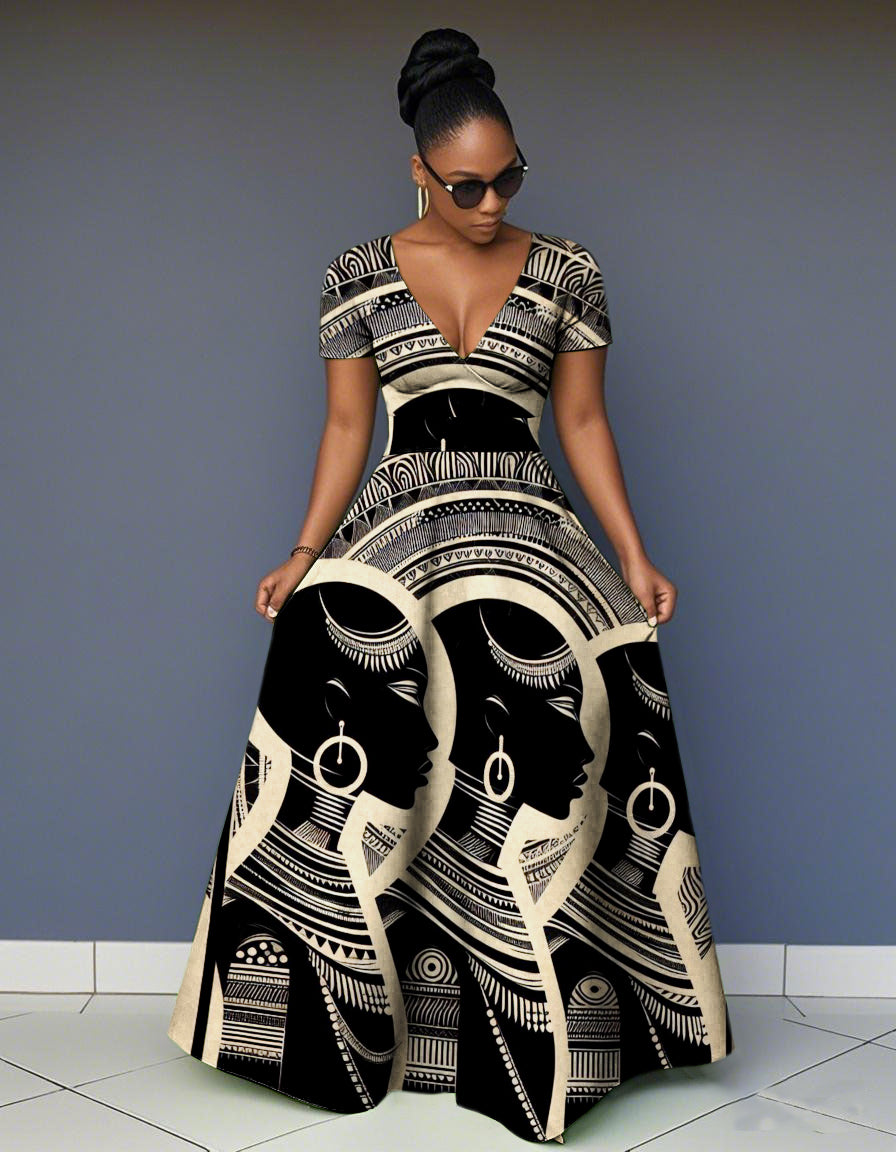V Neck African Woman Canvas Short Sleeve Maxi Dress