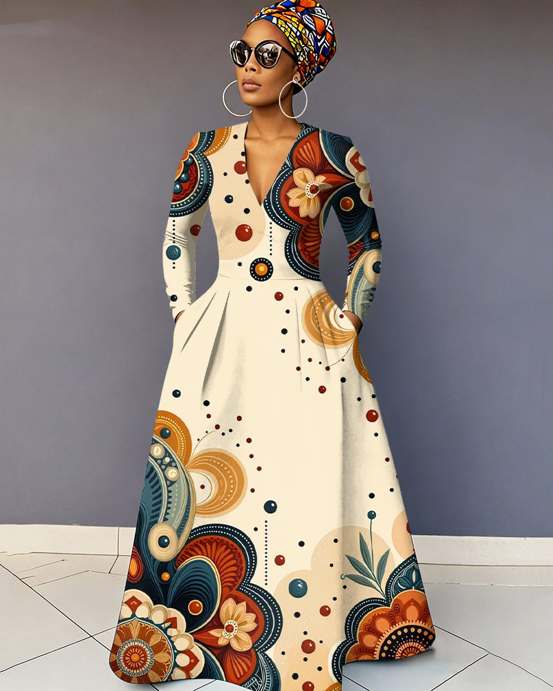 V-Neck Black Culture Bohemian Flower Long Sleeve Maxi Dress