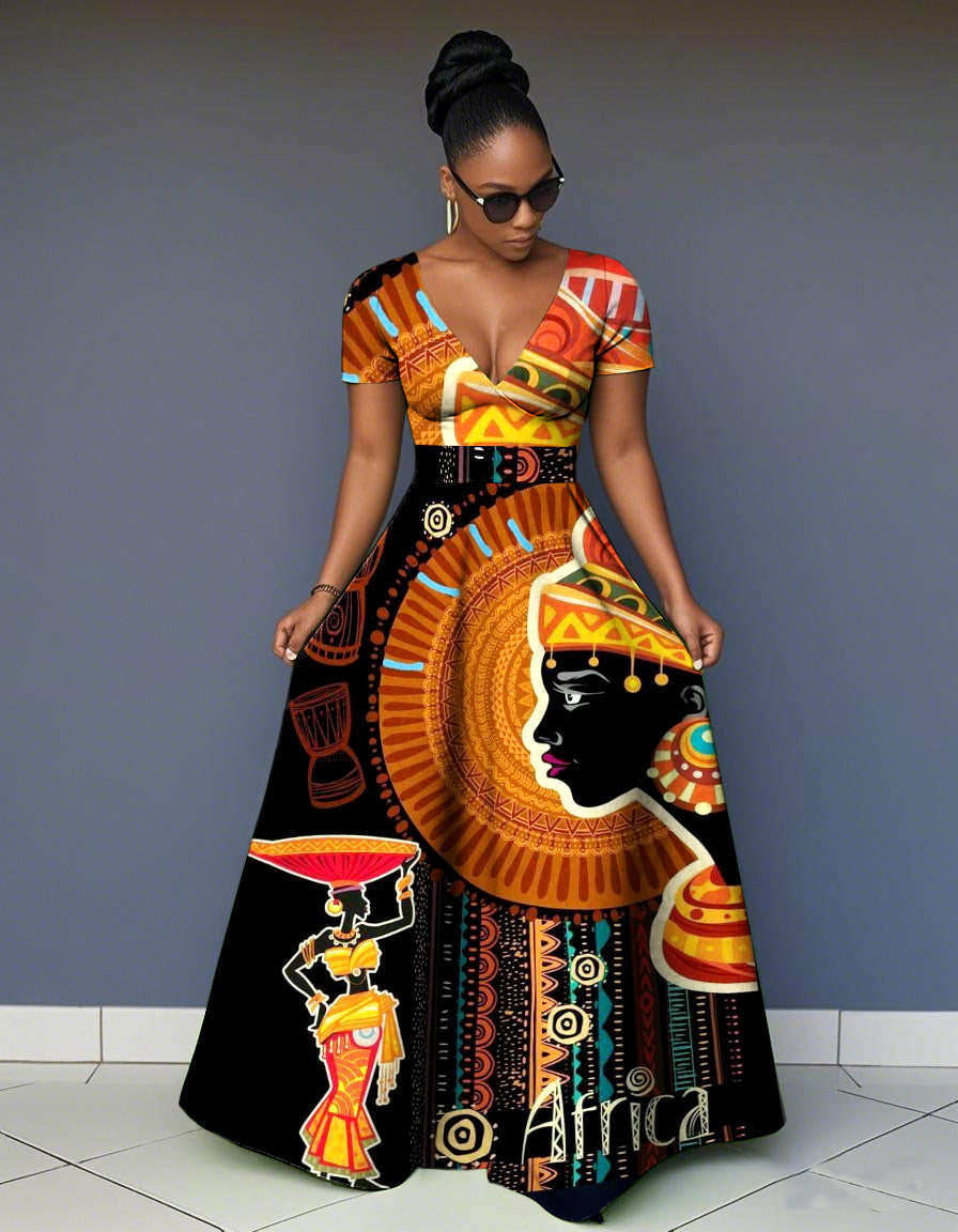 V Neck Black Woman Art Short Sleeve Maxi Dress