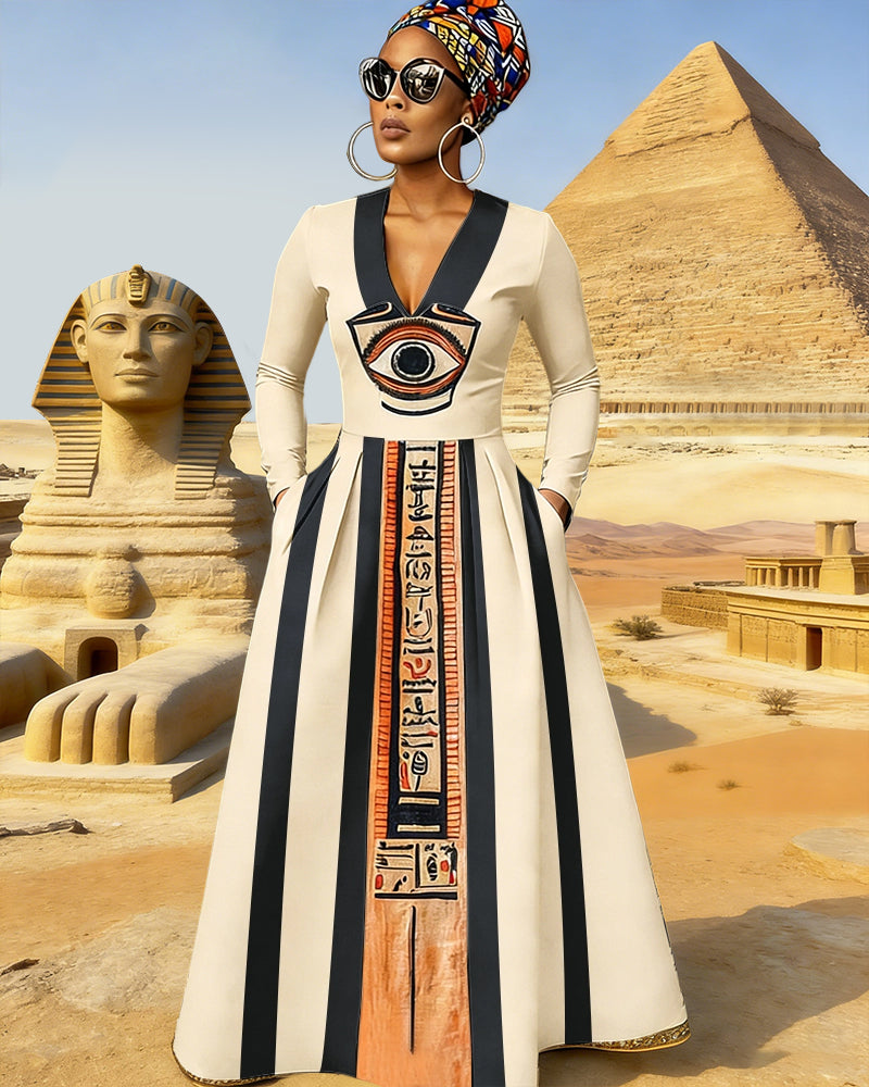 V-neck Egyptian Pharaoh's Eye Pocket Full Skirt Dress