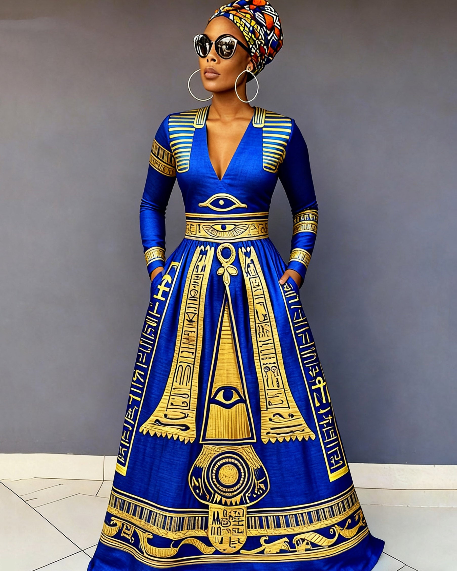 V-Neck Eye Of Horus Ancient Egyptian Totem Long-Sleeved Maxi Dress
