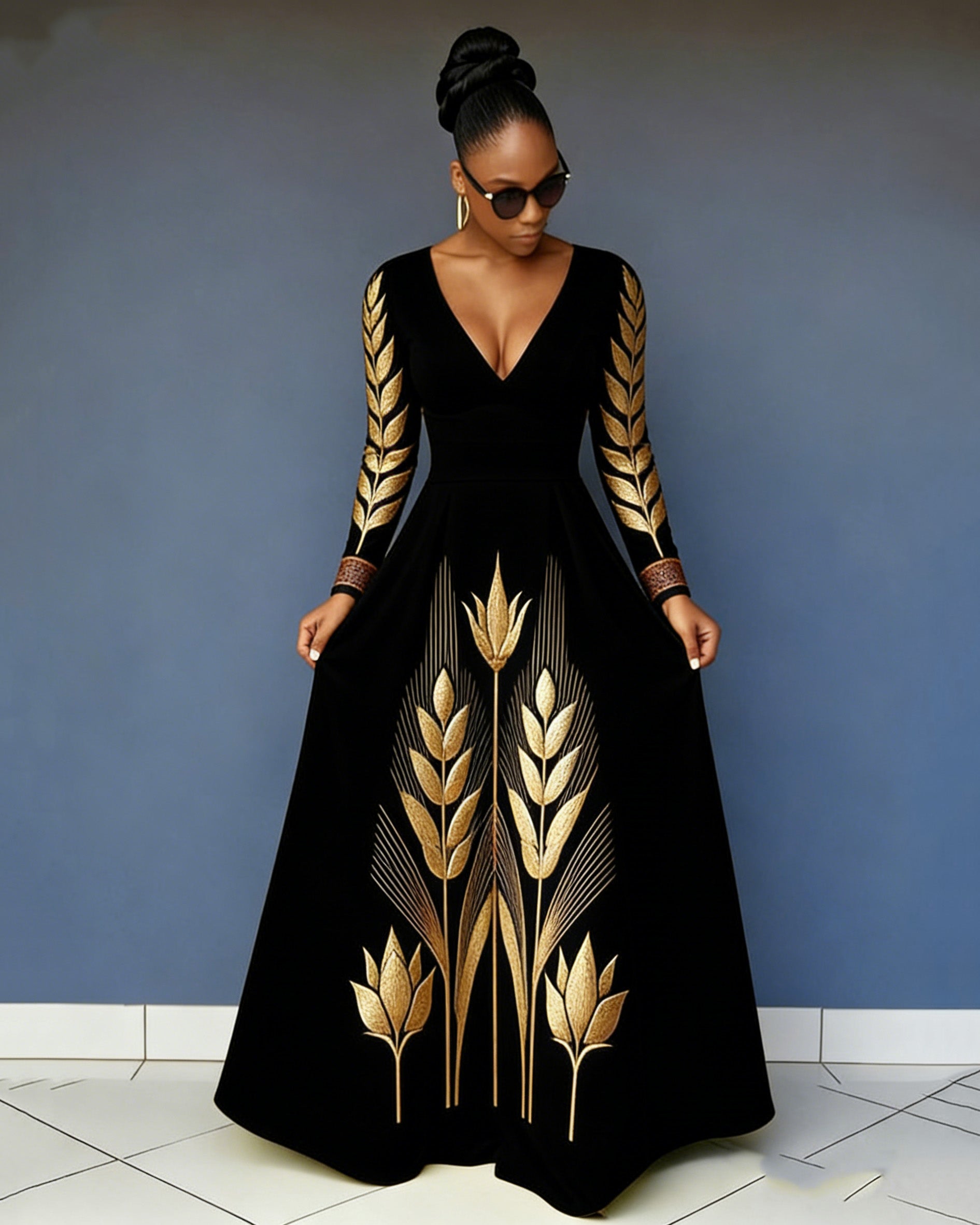 V-neck Gold Wheat Ear Print Pocket Maxi Dress