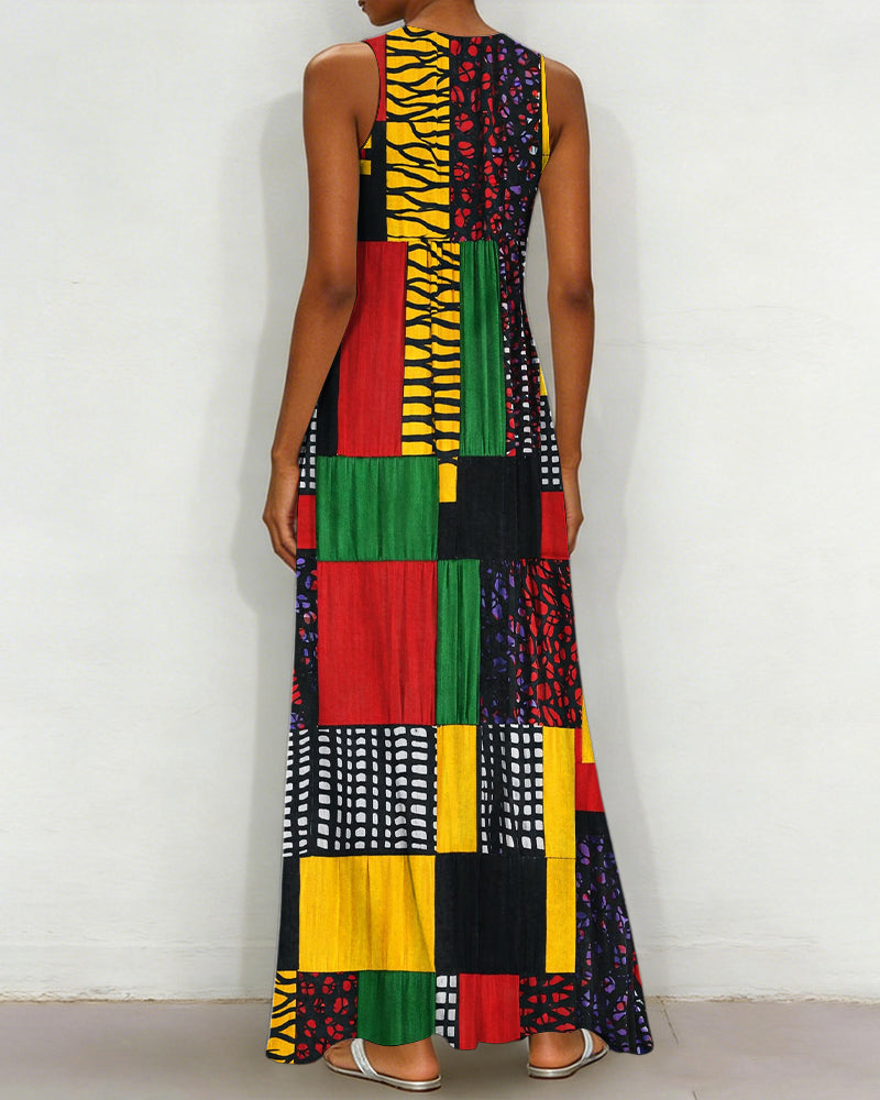 V-Neck Irregular Square Color Blocking Print Pocket Long Dress