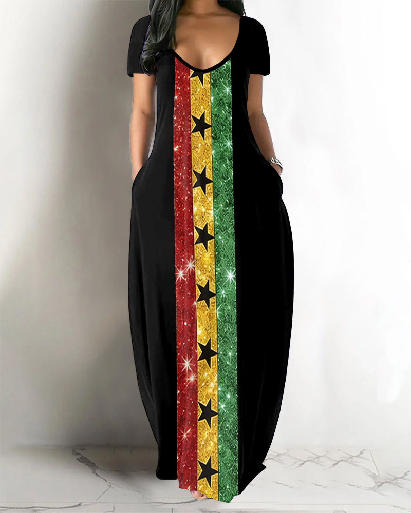 V-neck Reggae Striped Stars Pocket Short Sleeved Maxi Dress