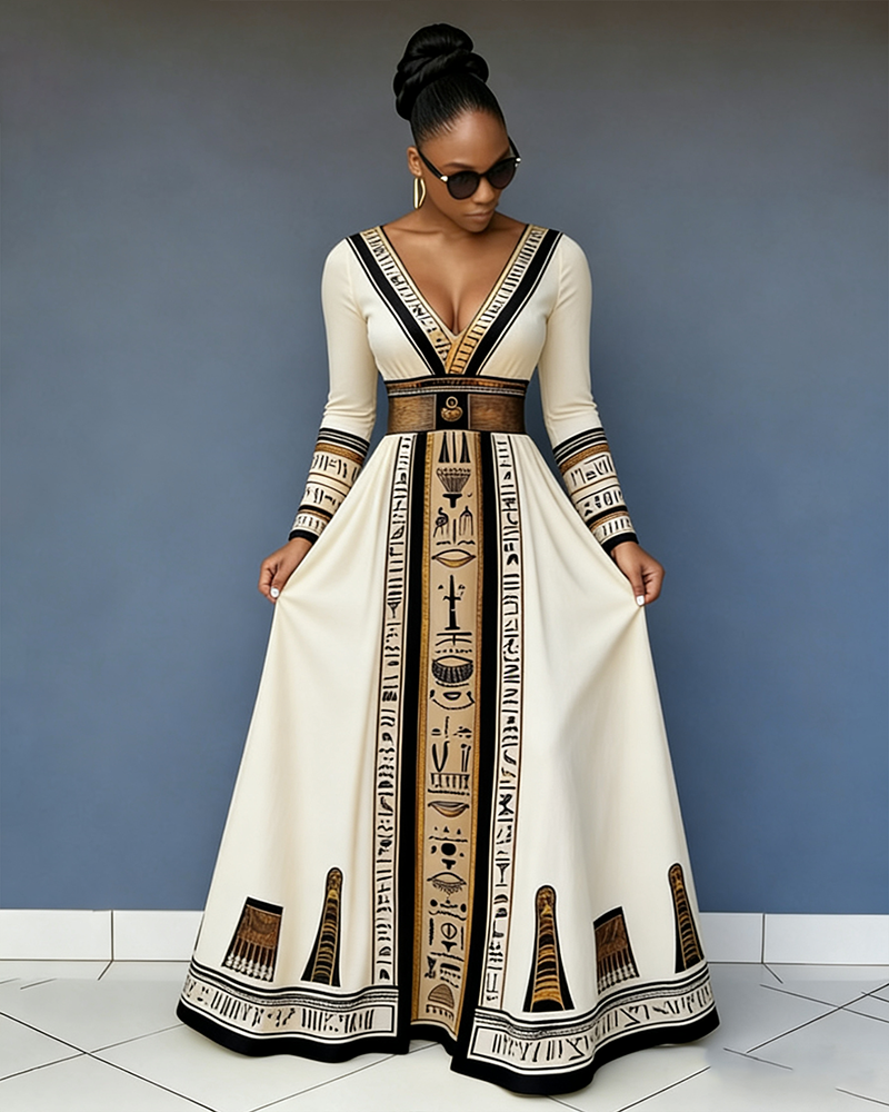 V-Neck Retro Black Cultural Totems Long-Sleeved Maxi Dress