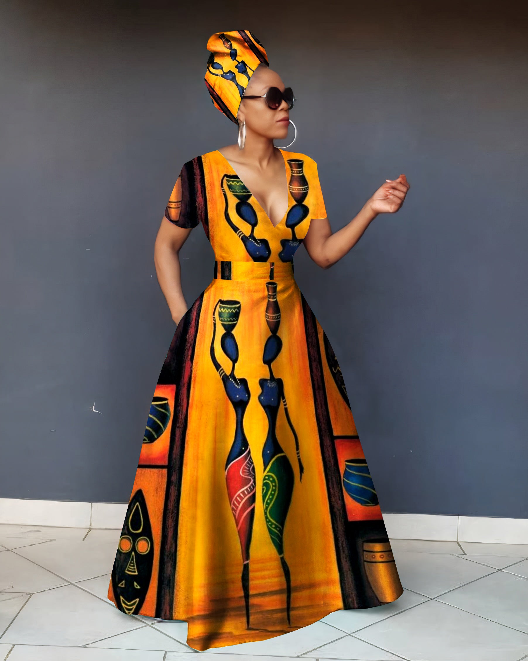V Neck Totem Color Block Print Short Sleeve Maxi Dress