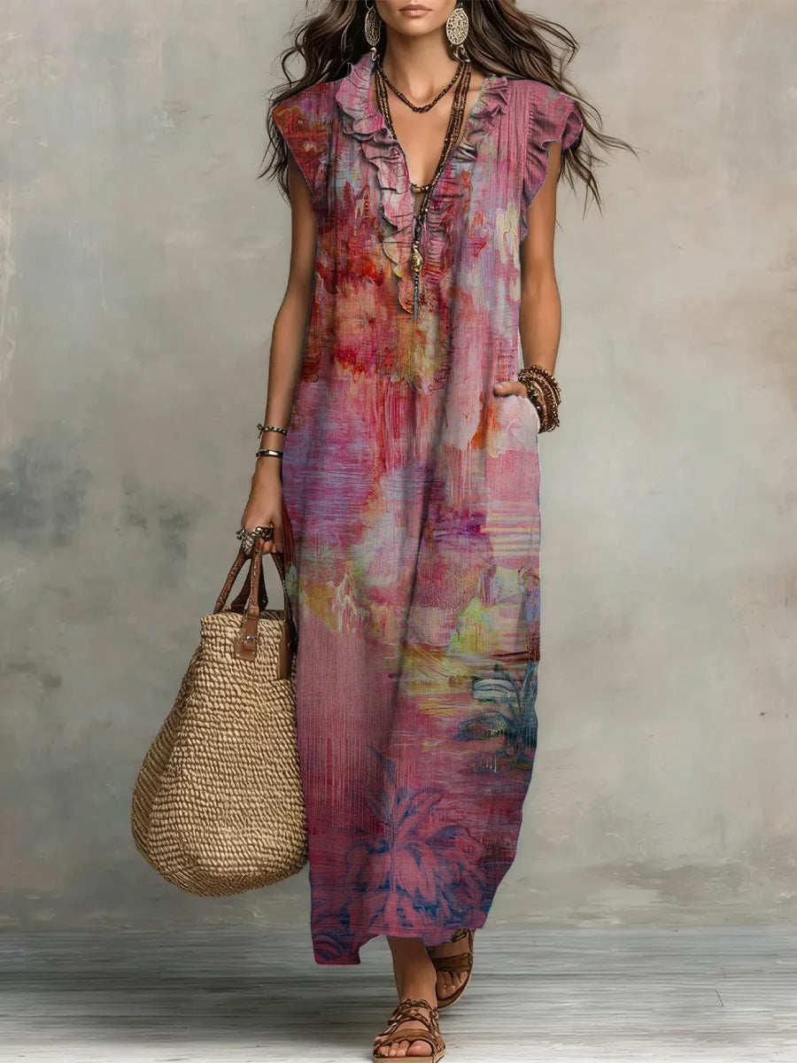 Vintage Oil Painting-print Cotton-linen Ruffled Dress