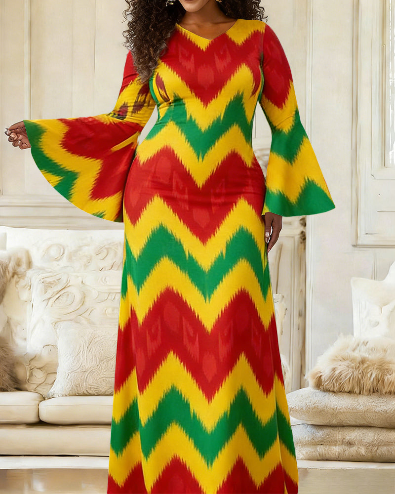 Women's Reggae Striped Contrast Elegant Bell-Sleeve Slim-Fit Dress