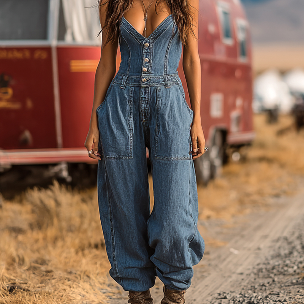 • Design Elements: Deep V-neckline, button front closure, wide leg design